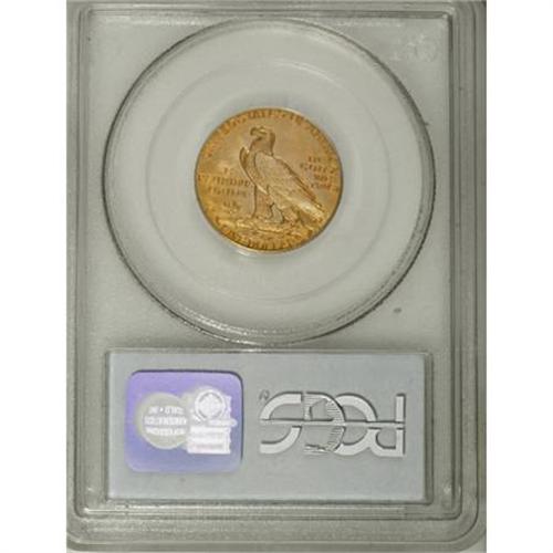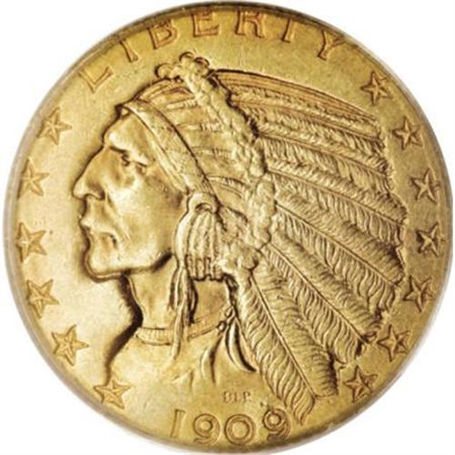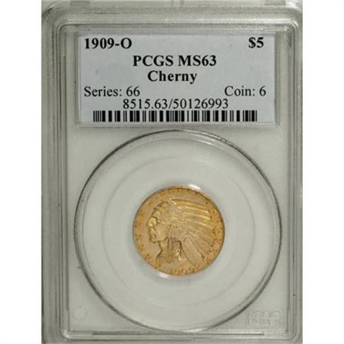 <B>1909-O $5 MS63 PCGS.</B></I> Ex: Cherny Collection. Variety One: The mintmark is weakly impressed and shows doubling on its left side. In 1909 the New Orleans Mint, not having struck a half eagle since 1894 nor a gold coin of any other denomination since 1906, struck a small quantity of half eagles: 34,200 pieces to be precise, making the issue the only O-mint Indian Head half eagle. That was not only the last gasp of the New Orleans Mint, whose fate had been sealed for several years since the new Denver Mint came online in 1906, but it was also the last O-mint gold coinage. The paltry mintage of 34,200 1909-O half eagles must have appeared especially insignificant next to the gargantuan emission of half eagles in 1909 from the Denver Mint, amounting to more than <I>3.4 million</B></I> examples! <BR> Although it is conditionally rare and one of several issues in the series that are elusive in the higher Mint State grades, the 1909-O thus bears a special allure "due to its status as a one-year type," as Douglas Winter puts it in <I>Gold Coins of the New Orleans Mint: 1839-1909. </B></I>The issue appears to have gone directly into circulation with little notice or fanfare, as the typical piece encountered today grades just AU or Choice AU. <BR> In MS63 grade, the present lot is one of only seven examples so graded at PCGS, with 13 finer, while NGC has graded six pieces in MS63, with 16 finer (7/07). As always, those population figures are almost certainly artificially augmented by resubmissions, in the case of this key-date issue likely multiple ones. <BR> While most 1909-Os seem to have rather unattractive patination, the MS63 coin that we offer here displays outstanding color characteristics--a blend of pretty orange-gold and mint-green. The luster is also pleasing, again unusual for the issue. Strike can be a problem on Mint State coins, especially on the lower feathers of the headdress and on the eagle's legs. The present coin is above average in those areas as well. The only hint of minor softness occurs on the mintmark, which is typical for the variety, and on the eagle's shoulder, but even there, all feather detail is visible. A few minute marks on the Indian's cheek and on the raised, exposed fields, especially on the reverse, preclude an even higher grade. Overall, a great representative of this key date.<BR><I>From The Jim O'Neal Collection of Indian Half Eagles.</B></I><BR><BR><B>Coin Engraver:</B> Bela Lyon Pratt<BR><BR><b>Shipping:</b> Coins & Currency (<a target="_blank" href="http://www.heritageauctions.com/common/shipping.php">view shipping information</a>)