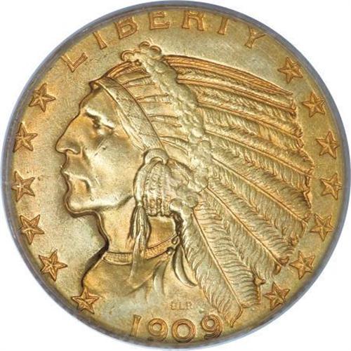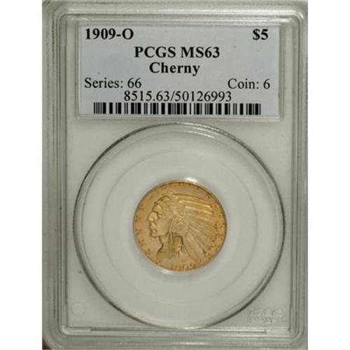 <B>1909-O $5 MS63 PCGS.</B></I> Ex: Cherny. Variety One: The mintmark is weakly impressed and shows doubling on its left side. In 1909 the New Orleans Mint, not having struck a half eagle since 1894 nor a gold coin of any other denomination since 1906, struck a small quantity of half eagles: 34,200 pieces to be precise, making the issue the only O-mint Indian Head half eagle. That was not only the last gasp of the New Orleans Mint, whose fate had been sealed for several years since the new Denver Mint came online in 1906, but it was also the last O-mint gold coinage. The paltry mintage of 34,200 1909-O half eagles must have appeared especially insignificant next to the gargantuan emission of half eagles in 1909 from the Denver Mint, amounting to more than <I>3.4 million</B></I> examples! <BR> Although it is conditionally rare and one of several issues in the series that are elusive in the higher Mint State grades, the 1909-O thus bears a special allure "due to its status as a one-year type," as Douglas Winter puts it in <I>Gold Coins of the New Orleans Mint: 1839-1909. </B></I>The issue appears to have gone directly into circulation with little notice or fanfare, as the typical piece encountered today grades just AU or Choice AU. The present lot is one of only seven examples MS63 graded at PCGS, with 13 finer (11/07). As always, those population figures are almost certainly artificially augmented by resubmissions.<BR> While most 1909-O fives seem to have rather unattractive patination, the Select piece offered here displays outstanding color characteristics--a blend of pretty orange-gold and mint-green. The luster is also pleasing, again unusual for the issue. Strike can be a problem on Mint State coins, especially on the lower feathers of the headdress and on the eagle's legs. The present coin is above average in those areas as well. The only hint of minor softness occurs on the mintmark, which is typical for the variety, and on the eagle's shoulder, but even there, all feather detail is visible. A few minute marks on the Indian's cheek and on the raised, exposed fields, especially on the reverse, preclude an even higher grade. Overall, a great representative of this key issue.<BR><BR><B>Coin Engraver:</B> Bela Lyon Pratt<BR><BR><b>Shipping:</b> Coins & Currency (<a target="_blank" href="http://www.heritageauctions.com/common/shipping.php">view shipping information</a>)
