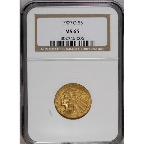 <B>1909-O<$5> MS65 NGC.</B></I> The city of New Orleans has been an important commercial center practically since it was founded along the banks of the Mississippi River in 1718. This fact was reinforced when the Federal Government established a branch mint there on March 3, 1835, along with two other Southern branch mints at Charlotte, North Carolina and Dahlonega, Georgia. Such action was deemed necessary partly as a result of President Andrew Jackson's veto of the charter of the Second Bank of the United States in 1832, and his executive order in 1836, called a specie circular, that demanded all land transactions in the United States be conducted in cash. Both of these actions, combined with the economic depression following the Panic of 1837 greatly increased the domestic need for minted money.<BR> New Orleans' strategic location along the Mississippi River made it a magnet for commercial activity. Much gold from Mexico passed through its port annually. In fact, in the early 19th century, New Orleans, which was the fifth largest city in America, conducted more foreign trade than any other city in the nation. It was also close to gold deposits recently discovered in Alabama. While the Mint in Philadelphia produced a substantial quantity of coinage, in the early 19th century, it could not disperse the money swiftly enough to the far regions of the new nation, particularly in the South and West. In contrast to the other two Southern branch mints that only struck gold coinage, the New Orleans Mint produced both gold and silver coins, which perhaps marked it as the most important branch mint in the country.<BR> The New Orleans Mint operated continuously from 1838 until January 26, 1861, when Louisiana seceded from the Union. On January 20th, the Secession Convention convened in New Orleans and passed an ordinance that allowed Federal employees to remain in their posts, bu