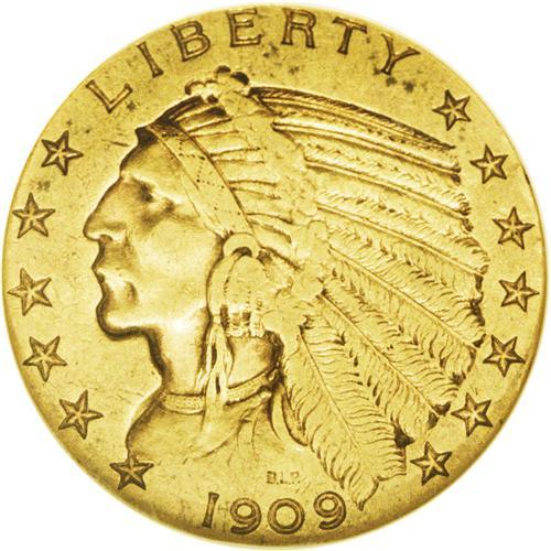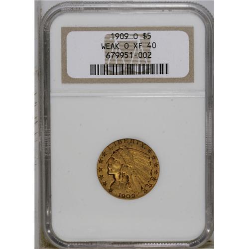 <B>1909-O $5 Weak O XF40 NGC.</B></I> The mintmark is visible primarily from its vertical center, which is darker than the tawny-gold field. The cheekbone and other design highpoints show slight wear, but substantial detail is present, and marks are fewer than expected for the grade. The low mintage 1909-O is the sole New Orleans gold issue struck after 1906.<BR><BR><b>Shipping:</b> Coin/Currency (<a target="_blank" href="http://www.heritageauctions.com/common/shipping.php">view shipping information</a>)