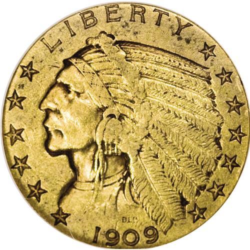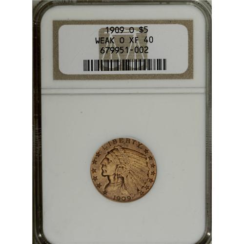 <B>1909-O $5 Weak O XF40 NGC.</B></I> The mintmark is visible primarily from its vertical center, which is darker than the tawny-gold field. The cheekbone and other design highpoints show slight wear, but substantial detail is present, and marks are fewer than expected for the grade. The low mintage 1909-O is the sole New Orleans gold issue struck after 1906.<BR><BR><b>Shipping:</b> Coins & Currency (<a target="_blank" href="http://www.heritageauctions.com/common/shipping.php">view shipping information</a>)