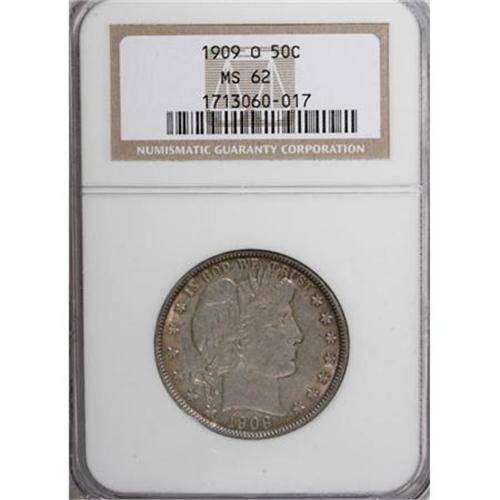 <B>1909-O 50C MS62 NGC.</B></I> A luminous Mint State representative of the last New Orleans half dollar issue, well struck with silver-blue centers and gold-orange at the margins. Census: 3 in 62, 44 finer (2/08).<BR><BR><B>Coin Engraver:</B> Charles E. Barber<BR><BR><b>Shipping:</b> Coins & Currency (<a target="_blank" href="http://www.heritageauctions.com/common/shipping.php">view shipping information</a>)