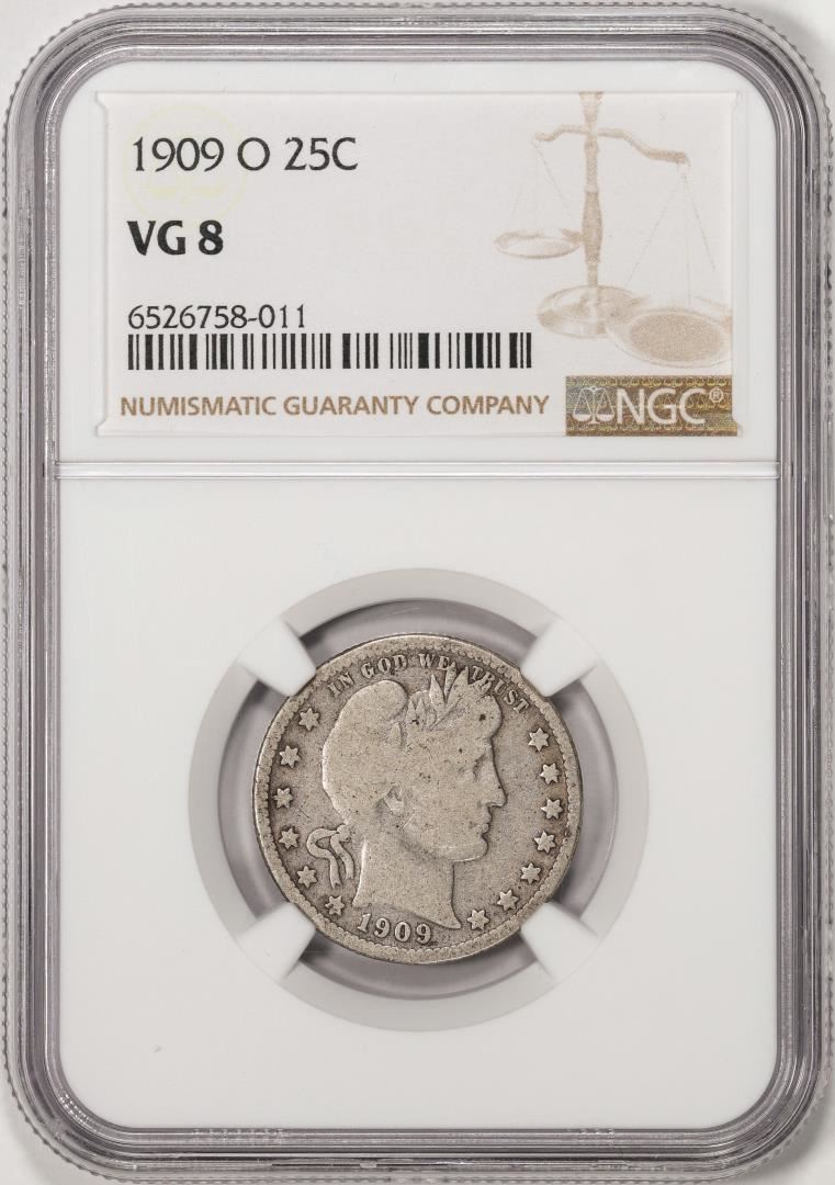 One 1909-O Barber Quarter Coin NGC VG8. NGC Certified.