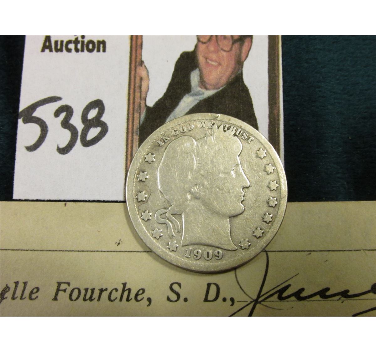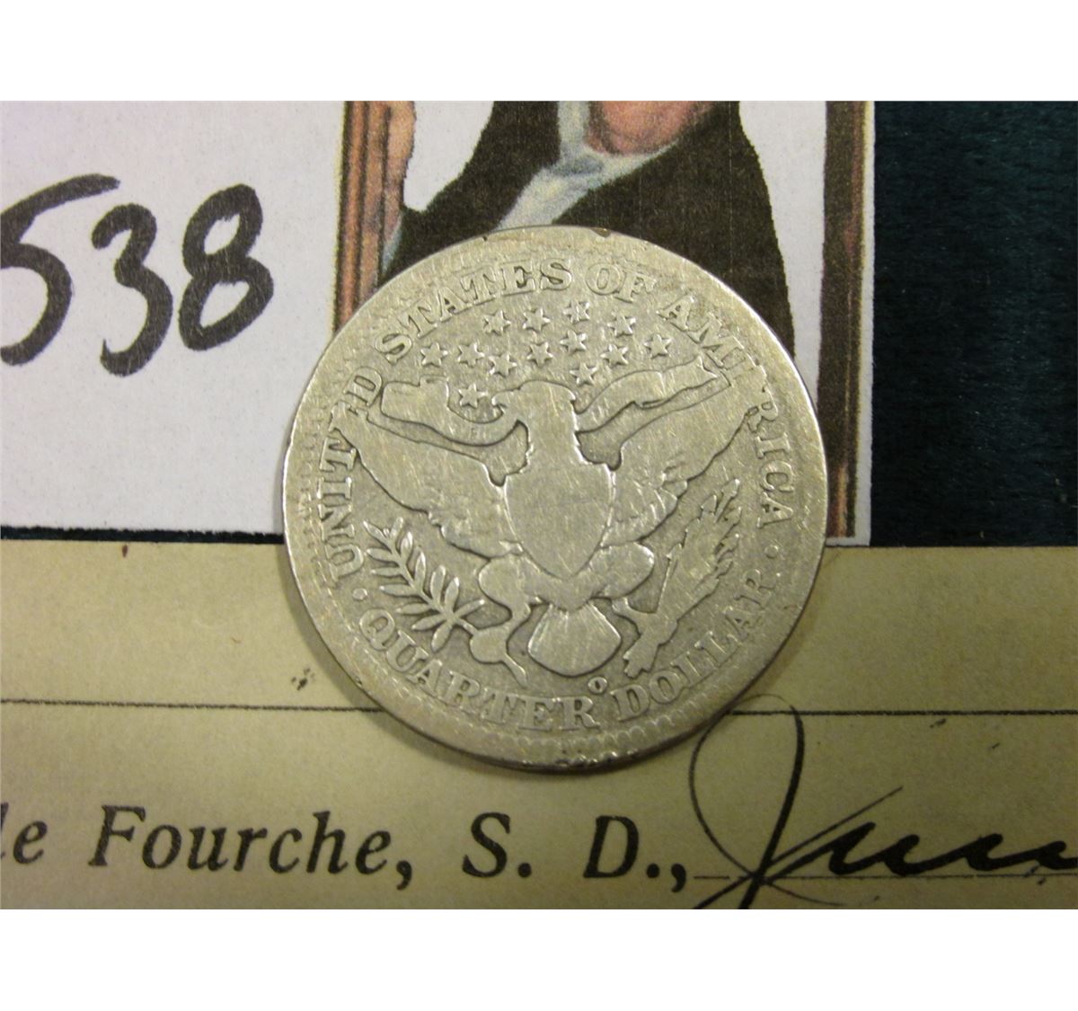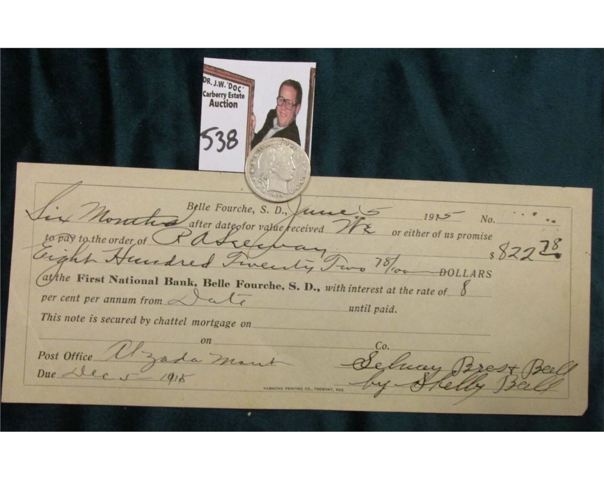 1909 O Barber Quarter, Good (Red Book $42); & a 1915 Promissory Note from Belle Foursche, S.D.