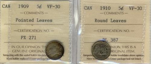 1909 Pointed Leaves , 1910 Round Leaves both ICCS VF30