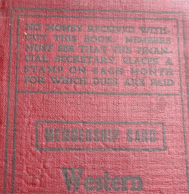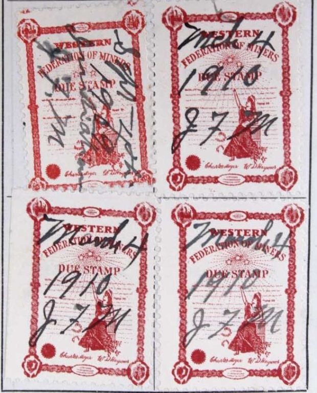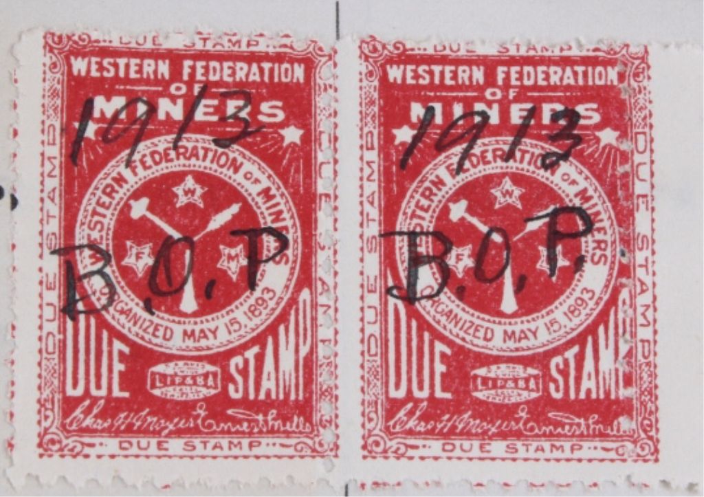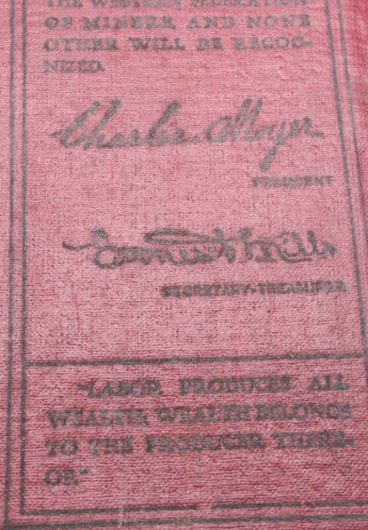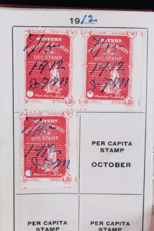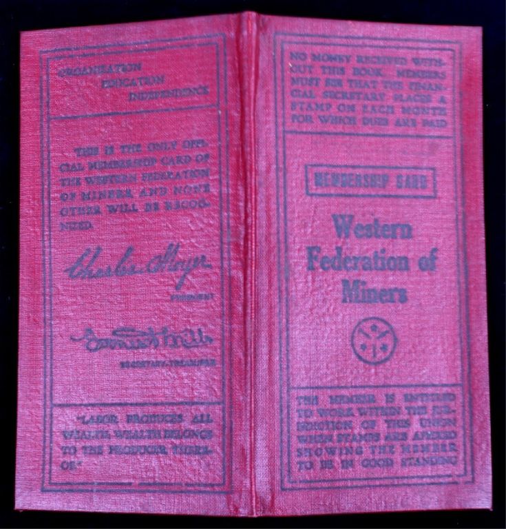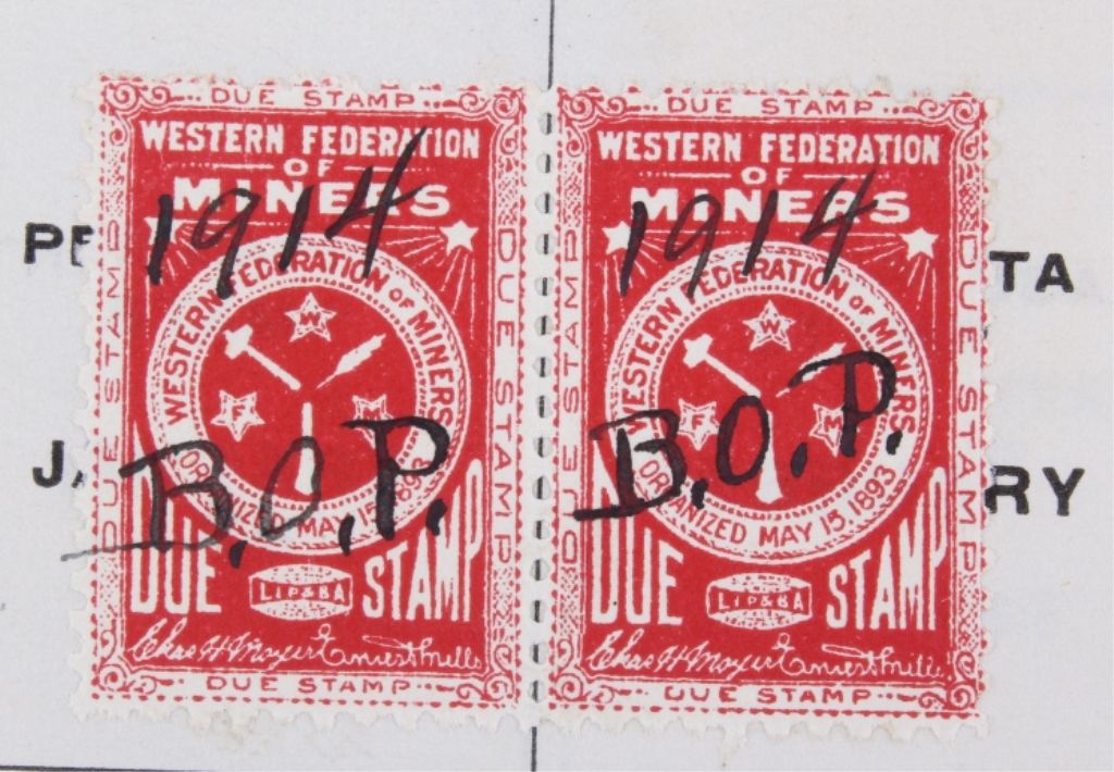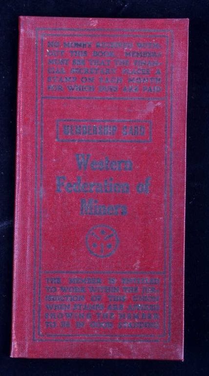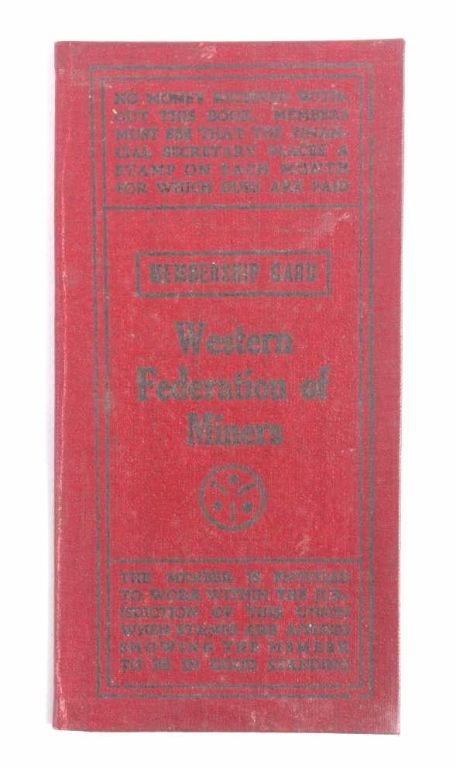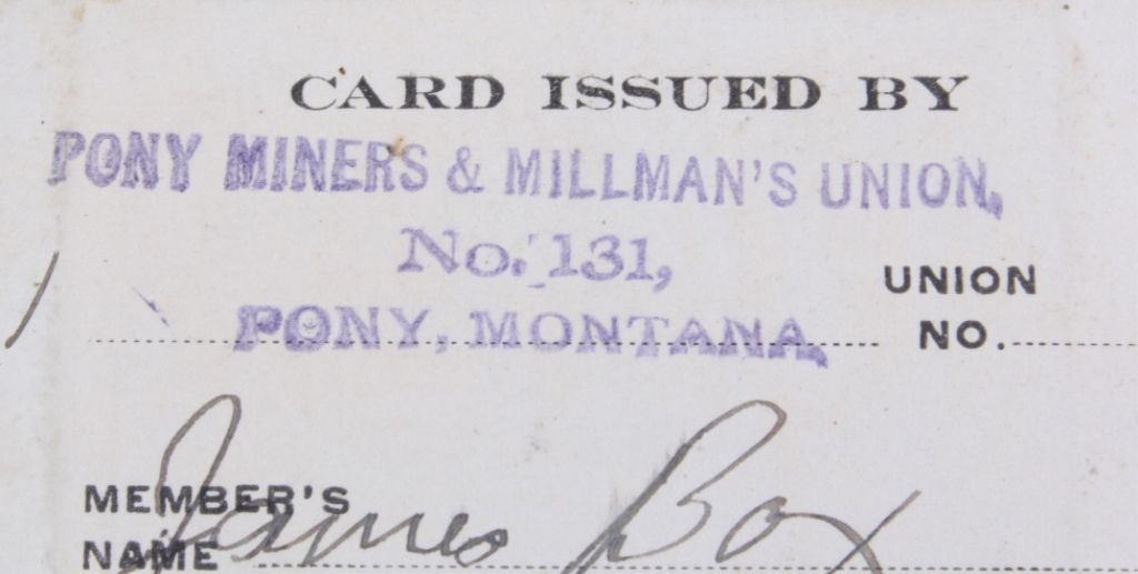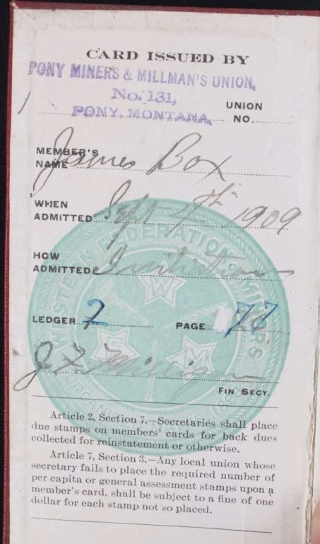 This is an original Western Federation of Miners Membership Card from Pony Miner's & Millman's Union, NO. 131, Pony, Montana. The card is signed 1909 by member James Box. The piece was made by the Merchants PublishingCo. Denver. This original piece of Montana Mining History also has the hand signed Union Due Stamps through out the entire book. Measures 2.75"x5.5"