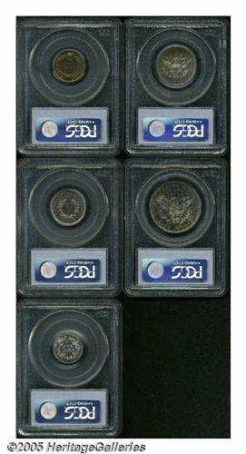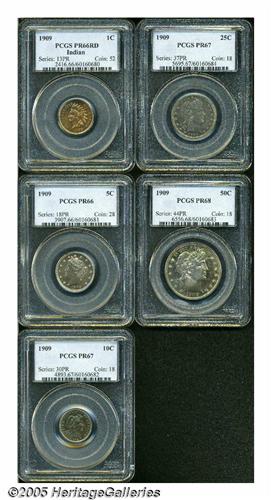 <B>1909 Proof Set PR66 to PR68 PCGS.</B></I> The lot includes:<BR><B>Indian Cent PR66 Red.</B></I> Beautiful peach and gold colors grace the obverse, the reverse is apricot in hue with wisps of olive-gray across the denomination. Intricately struck, the occasional pinpoint carbon fleck is noted for accuracy. The final year of the Indian Head design, proofs were also struck that year for the Lincoln Cent, with and without VDB initials.<BR><B>Liberty Nickel PR66.</B></I> Pastel apricot and plum colors adorn the unmarked surfaces. Fully struck, every kernel on the corn ears is intricately defined. An infrequent, miniscule carbon fleck prevents perfection.<BR><B>Barber Dime PR67.</B></I> Luxurious sea-green patination dominates the obverse, while the reverse displays blushes of light golden-brown color with dashes of apple-green toning at the borders. A prominently mirrored and razor-sharp Superb Gem. Less than 1,000 pieces were struck.<BR><B>Barber Quarter PR67.</B></I> Rich forest-green and rose-russet colors consume the obverse. The reverse is lighter in hue but nonetheless offers peripheral aquamarine and maroon-red patination. A meticulously struck and essentially immaculate specimen.<BR><B>Barber Half PR68.</B></I> Lush orange, electric-blue, and apple-green colors provide exceptional eye appeal. The strike is exacting, since only the right shield tip does not display complete definition of the design. This pristine type coin is worthy of the finest quality collection. Population: 6 in 68, 1 finer as PR68 Cameo (4/05).<BR><I>From The Western Hills Collection.</B></I>