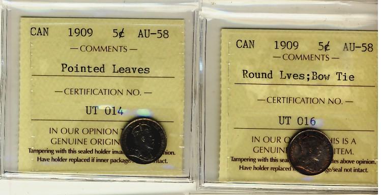1909 RL, Bow Tie & 1910 Ptd Lvs 5¢ ICCS AU58. Lot of 2 coins.