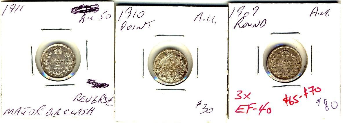 1909 Rd, 1910 Ptd & 1911 5¢. Lot of 3 coins all EF.