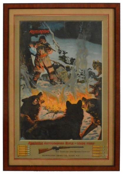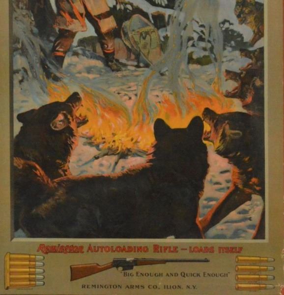 Depicting a hunter fedning off wolves with a Remington Model 8 rifle. Framed