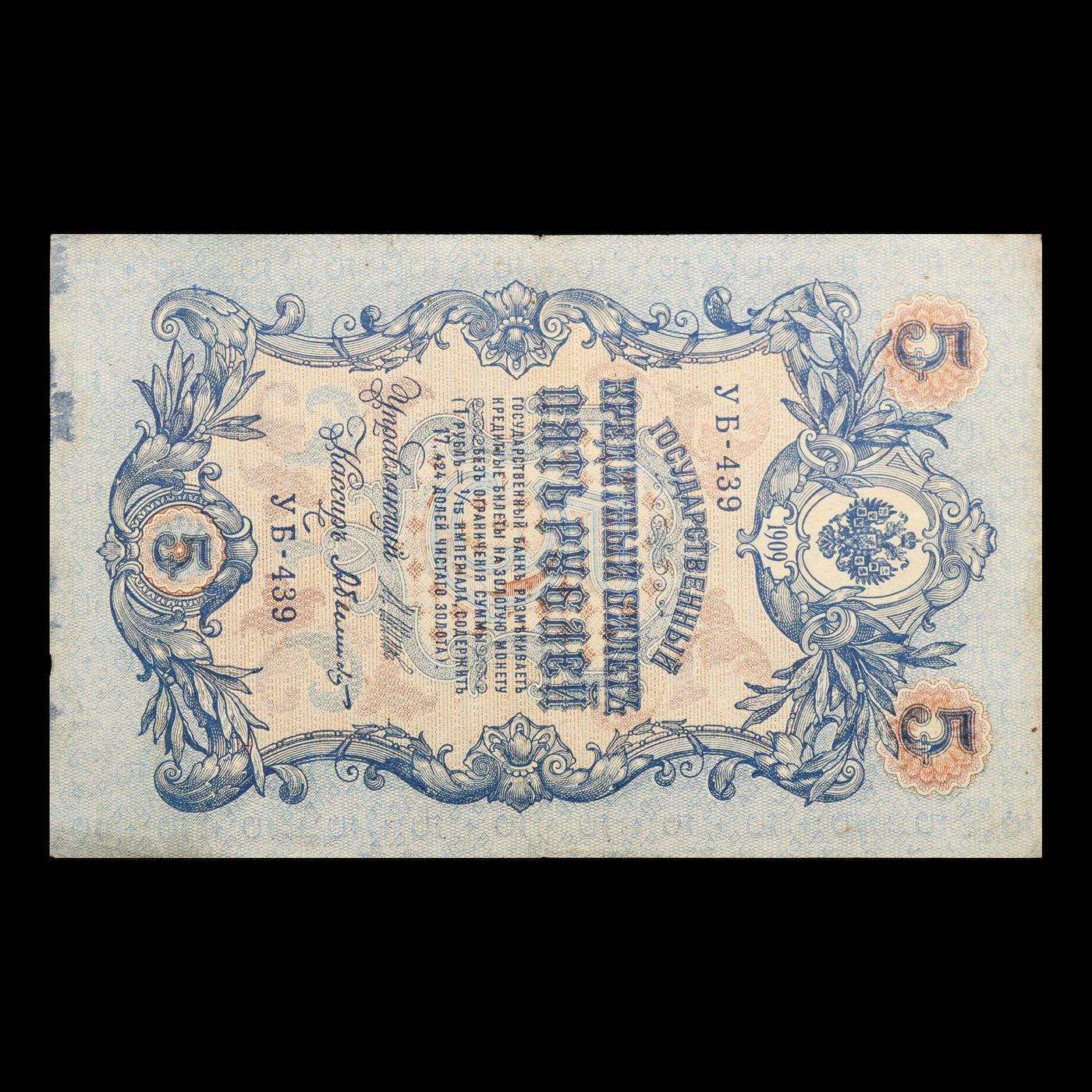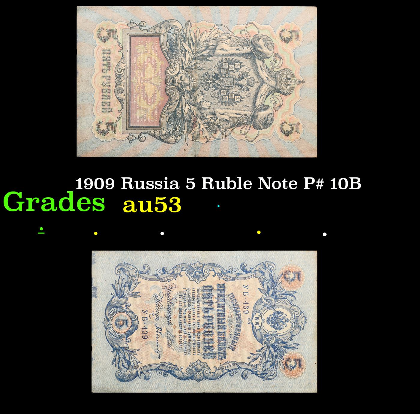 1909 Russia 5 Ruble Note P# 10B Grades Select AU. Up for auction we have a beautiful, ornate Imperial Ruble note from the final decade of the Russian Empire under Tsar Nicholas II, which managed to survive through the Russian Revolution and Civil War. These notes became relatively useless in the early Soviet period, due to hyperinflation and other factors, and many were lost or destroyed.