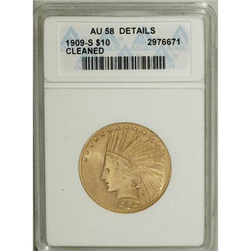 <B>1909-S $10 --Cleaned--ANACS. AU58 Details.</B></I> NGC Census: (120/161). PCGS Population (73/180). Mintage: 292,350. Numismedia Wsl. Price for NGC/PCGS coin in AU58: $550. (#8864)<BR><BR><b>Shipping:</b> Coins & Currency (<a target="_blank" href="http://www.heritageauctions.com/common/shipping.php">view shipping information</a>)