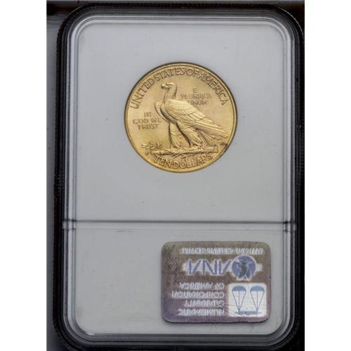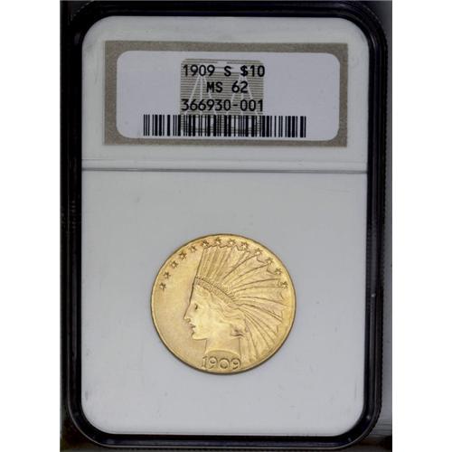 <B>1909-S<$10> MS62 NGC.</B></I> A highly lustrous and sharply struck example, khaki-yellow with rose accents. A reverse planchet flaw and light, scattered abrasions limit the grade, but this issue is elusive in any Mint State grade.