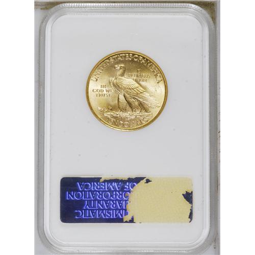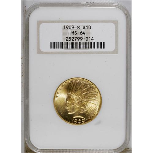 <B>1909-S<$10> MS64 NGC.</B></I> A condition rarity within the Indian eagle series. Examples of the 1909-S in MS64 number only a few dozen at both services combined, and only about two dozen Gem pieces are known. This is a blazing yellow-gold example, with fine-grained, mattelike surfaces. Only a few light abrasions on the Indian's cheek apparently preclude a Gem grade, but the eye appeal is hands-down finer than most examples of the series or issue. The reverse is remarkably pristine. A nice one! Census: 30 in 64, 9 finer (9/06).