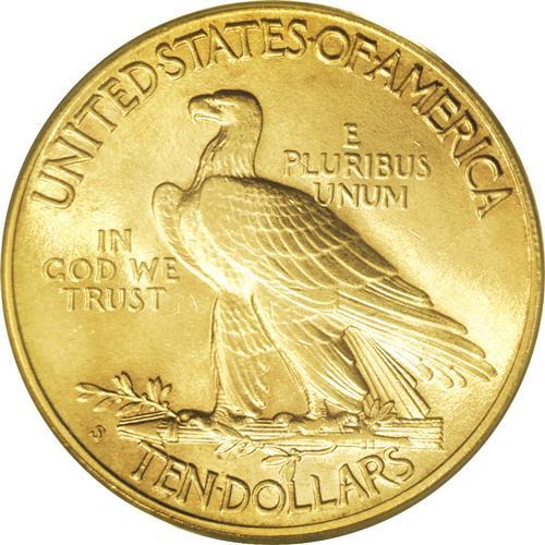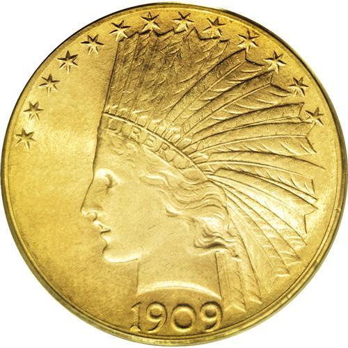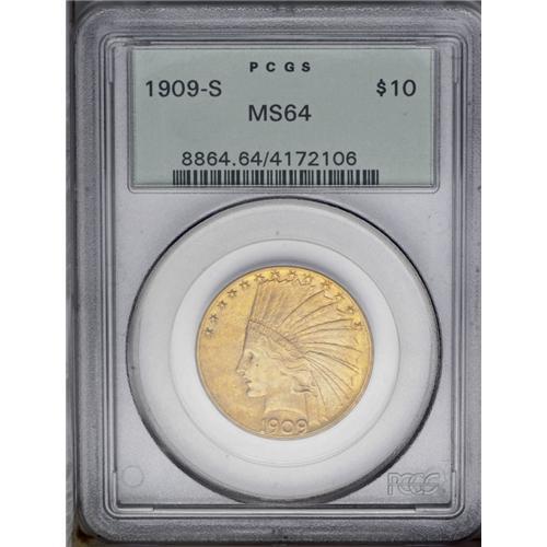 <B>1909-S<$10> MS64 PCGS.</B></I> Breen-7108. The mintmark is repunched east. Die doubling is also evident on the base of DOLLARS. All San Francisco Mint Indian eagles are difficult in better Uncirculated grades, perhaps because they circulated to a limited extent on the West coast. This beautiful orange-gold near-Gem is refreshingly smooth, nicely struck, and housed in a green label holder. Population: 39 in 64, 20 finer (4/06).