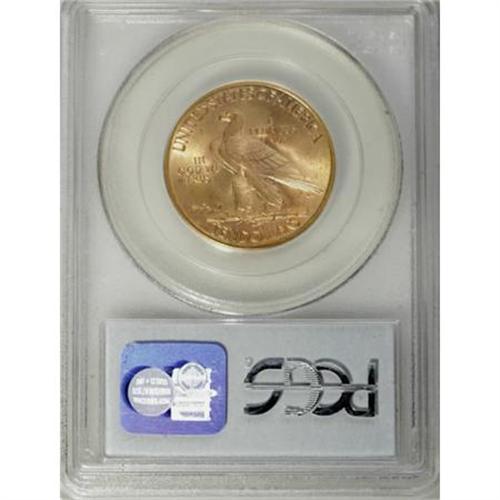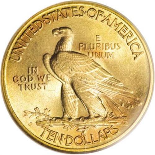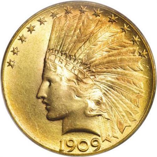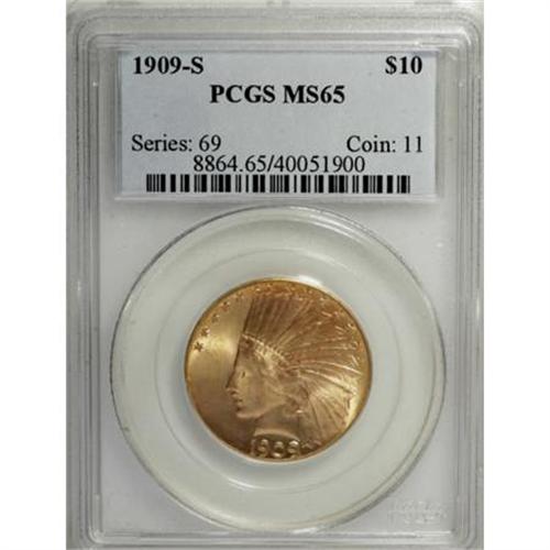 <B>1909-S $10 MS65 PCGS.</B></I> In 1909, the San Francisco Mint struck 292,350 Indian ten dollar gold pieces, but it remains a tricky issue for the specialist assembling a Gem set of ten Indians. Jeff Garrett and Ron Guth note, "The 1909-S is far more difficult to obtain than expected, particularly so in gem grades. This is made more poignant by the fact that a large number of Mint State examples were discovered in an otherwise random hoard around 1977." In <I>The Coinage of Augustus Saint-Gaudens,</B></I> the authors reveal that, prior to the discovery of this hoard of about 60 pieces, "this issue was virtually impossible to obtain in Uncirculated condition."<BR> Despite the uncovering of a few other small hoards that substantially raised the Mint State population, "the '09-S is still very scarce in Mint State, with most pieces in MS62 to MS64 grades. It remains one of the most difficult issues in the entire series to locate in Gem condition." This is certainly one of the finest of this difficult issue, as PCGS has graded only 19 in MS65 condition and eight finer. Akers (1988) has declared that the 1909-S in generally comes in one of two categories: " ... either very frosty with very little granularity, or slightly satiny." This piece is frosted and it displays a subtle interplay of rose-gold and lilac color on each side. The surfaces are exceptionally clean and this is one of the finest '09-S tens we have seen in recent memory. <BR><BR><B>Coin Engraver:</B> Augustus Saint-Gaudens<BR><BR><b>Shipping:</b> Coins & Currency (<a target="_blank" href="http://www.heritageauctions.com/common/shipping.php">view shipping information</a>)