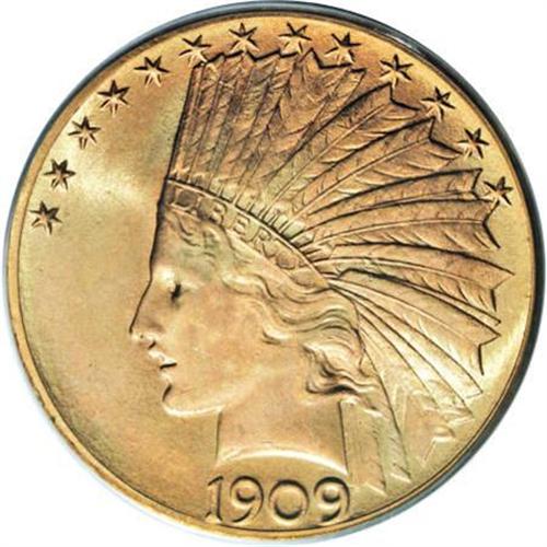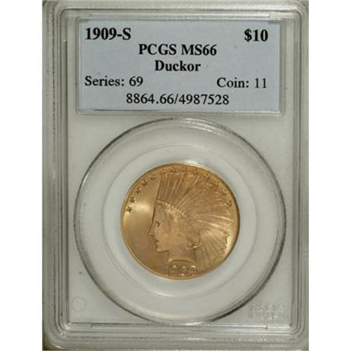 <B>1909-S $10 MS66 PCGS.</B></I> Ex: Duckor Collection. In the late 1970s, the discovery of a hoard of about 60 1909-S ten dollar pieces was sold intact by Ron Gillio to Jim Halperin of New England Rare Coin Galleries. Previously, this issue was virtually impossible to obtain in Uncirculated condition. Since then, a few other small hoards have been found, substantially raising the Mint State population. Despite these discoveries, the '09-S is still very scarce in Mint State, with most pieces residing in the MS62 to MS64 range. It remains one of the most difficult issues in the entire series to locate as a Gem, and in finer grades.<BR> Most Uncirculated 1909-S examples, including those from the above-mentioned late-1970s hoard, are generally well struck, and exhibit average to slightly above-average luster, as does this piece. The color is an attractive mixture of orange-gold and rose-gold shades, lending a fully original appearance overall. The surfaces are frosty, with little granularity and only a couple of minor abrasions on Liberty's chin and lower neck. These are mentioned only for future identification purposes. Population: 5 in 66, 2 finer (11/07).<BR><BR><B>Coin Engraver:</B> Augustus Saint-Gaudens<BR><BR><b>Shipping:</b> Coins & Currency (<a target="_blank" href="http://www.heritageauctions.com/common/shipping.php">view shipping information</a>)