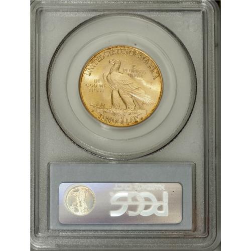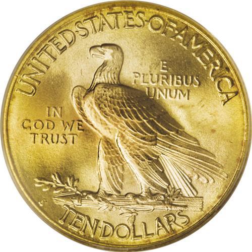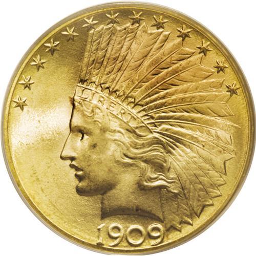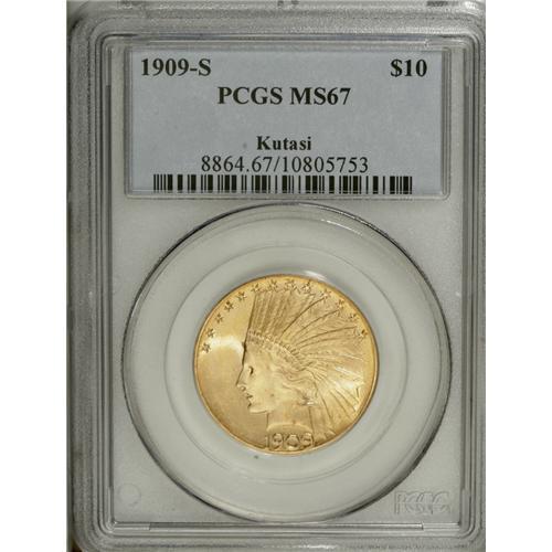<B>1909-S $10 MS67 PCGS.</B></I> Work on the new design San Francisco eagles did not begin until August when a small quantity were struck during the visit of Director Leach. These were found to be too thick and it was not until mid-September that satisfactory coins were struck. Seven obverse and seven reverse dies were used to produce the San Francisco Mint's 1909 eagles. Each die pair struck on average 41,898 coins with total production of 293,287 pieces for the year. The net mintage--coins that were of proper weight, fineness, and without production defects--was 292,350 coins, indicating that just 937 defective pieces were made. Compared to the Philadelphia Mint's defect rate of nearly 3%, it seems the San Francisco Mint staff knew better how to mint these gold coins.<BR> This is certainly a well-produced example of this median rarity in the ten dollar Indian series. The surfaces shout with luster--the bright, swirling cartwheel luster that S-mint coins are so well known for. Akers (1988) classes the 1909-S in two categories: " ... either very frosty with very little granularity, or slightly satiny." This piece is clearly an example of the former finish. Additionally, the striking details are boldly defined throughout, and there are no mentionable marks on either side. The only recorded hoard of this issue was a group of 70-90 pieces found in South America in 1977. Most of these pieces were of MS60-63 quality, which would lead one to the conclusion that this piece is probably not from that hoard and has been in a high grade date or type set since the year of issue. This piece is tied with one other at the MS67 level, and is exceeded only by a single MS68 coin at NGC (10/06). This is the first offering by Heritage of a MS67 example of this date.<BR><I>From The Kutasi Collection.</B></I><BR><BR><b>Shipping:</b> Coin/Currency (<a target="_blank" href="http://www.heritageauctions.com/common/shipping.php">view shipping information</a>)