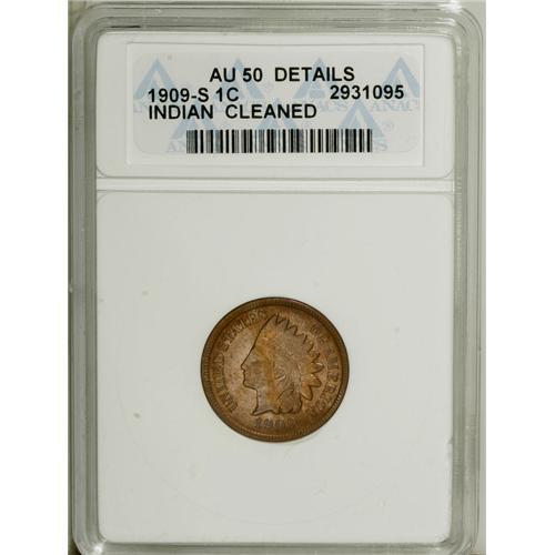 <B>1909-S 1C --Cleaned--ANACS. AU50 Details.</B></I> NGC Census: (21/269). PCGS Population (62/270). Mintage: 309,000. Numismedia Wsl. Price for NGC/PCGS coin in AU50: $540. (#2238)<BR><BR><b>Shipping:</b> Coins & Currency (<a target="_blank" href="http://www.heritageauctions.com/common/shipping.php">view shipping information</a>)