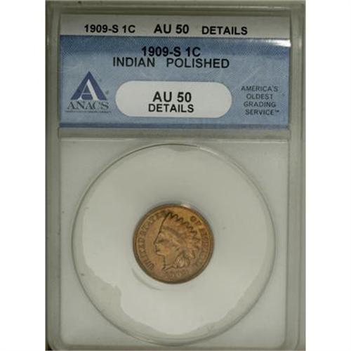 <B>1909-S 1C --Polished--ANACS. AU50 Details.</B></I> NGC Census: (25/292). PCGS Population (67/288). Mintage: 309,000. Numismedia Wsl. Price for NGC/PCGS coin in AU50: $600. (#2238)<BR><BR><B>Coin Engraver:</B> James B. Longacre<BR><BR><b>Shipping:</b> Coins & Currency (<a target="_blank" href="http://www.heritageauctions.com/common/shipping.php">view shipping information</a>)