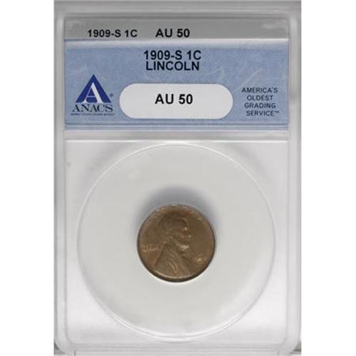 <B>1909-S 1C AU50 ANACS.</B></I> NGC Census: (14/206). PCGS Population (31/221). Mintage: 1,825,000. Numismedia Wsl. Price for NGC/PCGS coin in AU50: $180. (#2432)<BR><BR><B>Coin Engraver:</B> Victor D. Brenner<BR><BR><b>Shipping:</b> Coins & Currency (<a target="_blank" href="http://www.heritageauctions.com/common/shipping.php">view shipping information</a>)