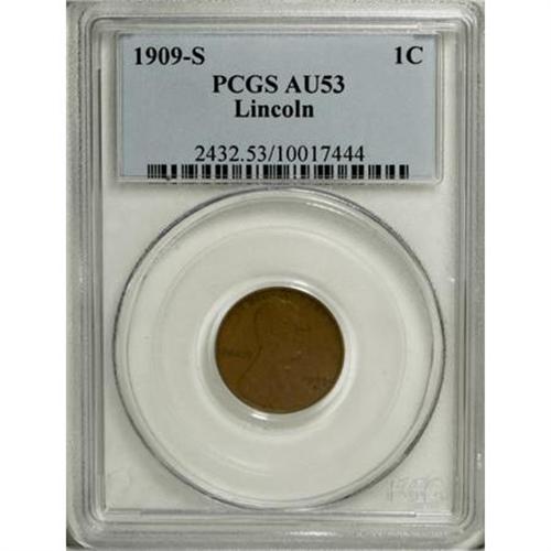 <B>1909-S 1C AU53 PCGS.</B></I> PCGS Population (14/195). NGC Census: (7/179). Mintage: 1,825,000. Numismedia Wsl. Price for NGC/PCGS coin in AU53: $185. (#2432)<BR><BR><B>Coin Engraver:</B> Victor D. Brenner<BR><BR><b>Shipping:</b> Coins & Currency (<a target="_blank" href="http://www.heritageauctions.com/common/shipping.php">view shipping information</a>)