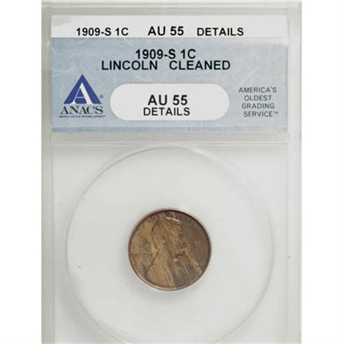 <B>1909-S 1C --Cleaned--ANACS. AU55 Details.</B></I> NGC Census: (24/174). PCGS Population (40/166). Mintage: 1,825,000. Numismedia Wsl. Price for NGC/PCGS coin in AU55: $190. (#2432)<BR><BR><B>Coin Engraver:</B> Victor D. Brenner<BR><BR><b>Shipping:</b> Coins & Currency (<a target="_blank" href="http://www.heritageauctions.com/common/shipping.php">view shipping information</a>)