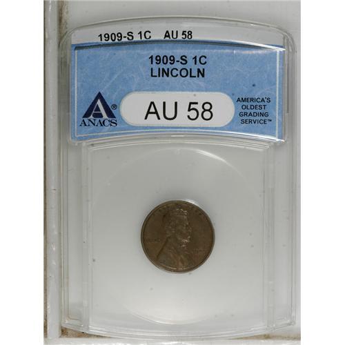<B>1909-S 1C AU58 ANACS.</B></I> NGC Census: (31/148). PCGS Population (37/0). Mintage: 1,825,000. Numismedia Wsl. Price for NGC/PCGS coin in AU58: $192. (#2432)<BR><BR><b>Shipping:</b> Coins & Currency (<a target="_blank" href="http://www.heritageauctions.com/common/shipping.php">view shipping information</a>)