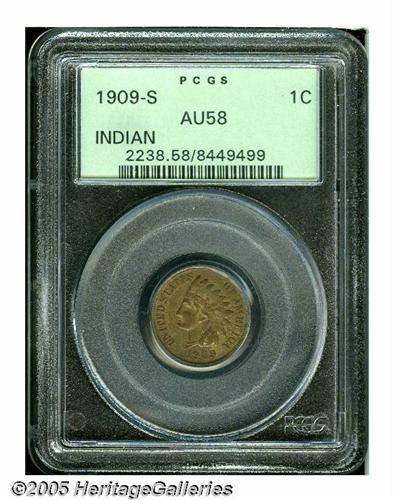 <B>1909-S<1C> AU58 PCGS.</B></I> Softly struck on the upper feathertips of the headdress, with a subdued overall appearance, some remnants of orange luster peeking through the drab brown coloration, partial fingerprint fragments on the obverse, and a few flyspecks. Free of obvious wear, and unabraded, however. Population: 64 in 58, 90 finer (3/05).