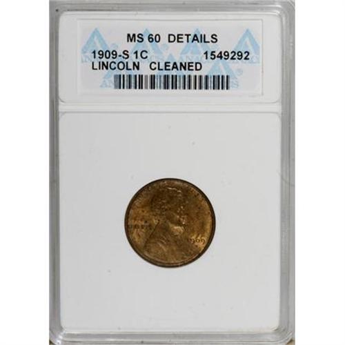 <B>1909-S 1C Brown--Cleaned--ANACS. MS60 Details.</B></I> NGC Census: (0/126). PCGS Population (5/104). Mintage: 1,825,000. Numismedia Wsl. Price for NGC/PCGS coin in MS60: $220. (#2432)<BR><BR><B>Coin Engraver:</B> Victor D. Brenner<BR><BR><b>Shipping:</b> Coins & Currency (<a target="_blank" href="http://www.heritageauctions.com/common/shipping.php">view shipping information</a>\)
