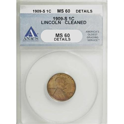 <B>1909-S 1C Brown--Cleaned--ANACS MS60 Details.</B></I> NGC Census: (0/139). PCGS Population (5/122). Mintage: 1,825,000. Numismedia Wsl. Price for NGC/PCGS coin in MS60: $235. (#2432)<BR><BR><B>Coin Engraver:</B> Victor D. Brenner<BR><BR><b>Shipping:</b> Coins & Currency (<a target="_blank" href="http://www.heritageauctions.com/common/shipping.php">view shipping information</a>)