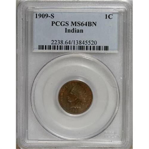 <B>1909-S 1C MS64 Brown PCGS.</B></I> PCGS Population (28/5). NGC Census: (51/20). Mintage: 309,000. Numismedia Wsl. Price for NGC/PCGS coin in MS64: $875. (#2238)<BR><BR><B>Coin Engraver:</B> James B. Longacre<BR><BR><b>Shipping:</b> Coins & Currency (<a target="_blank" href="http://www.heritageauctions.com/common/shipping.php">view shipping information</a>\)