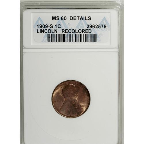 <B>1909-S 1C --Recolored--ANACS. MS60 Details.</B></I> NGC Census: (0/146). PCGS Population (5/102). Mintage: 1,825,000. Numismedia Wsl. Price: $212. (#2432)<BR><BR><b>Shipping:</b> Coins & Currency (<a target="_blank" href="http://www.heritageauctions.com/common/shipping.php">view shipping information</a>)