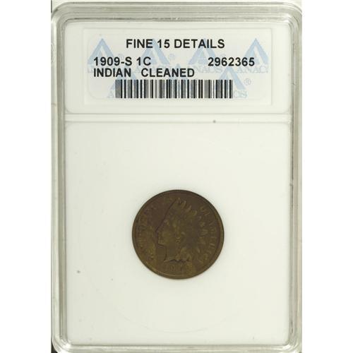 <B>1909-S 1C --Cleaned--ANACS. Fine 15 Details.</B></I> NGC Census: (106/1001). PCGS Population (105/1010). Mintage: 309,000. Numismedia Wsl. Price for NGC/PCGS coin in F15: $425. (#2238)<BR><BR><b>Shipping:</b> Coins & Currency (<a target="_blank" href="http://www.heritageauctions.com/common/shipping.php">view shipping information</a>)