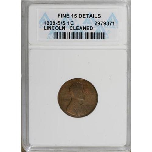 <B>1909-S/S 1C --Cleaned--ANACS. Fine 15 Details.</B></I> NGC Census: (36/385). PCGS Population (39/593). Mintage: 1,825,000. Numismedia Wsl. Price for NGC/PCGS coin in F15: $96. (#2432)<BR><BR><b>Shipping:</b> Coins & Currency (<a target="_blank" href="http://www.heritageauctions.com/common/shipping.php">view shipping information</a>)