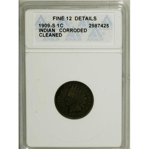 <B>1909-S 1C --Cleaned, Corroded--ANACS. Fine 12 Details.</B></I> NGC Census: (57/689). PCGS Population (105/1137). Mintage: 309,000. Numismedia Wsl. Price for NGC/PCGS coin in F12: $421. (#2238)<BR><BR><b>Shipping:</b> Coins & Currency (<a target="_blank" href="http://www.heritageauctions.com/common/shipping.php">view shipping information</a>)
