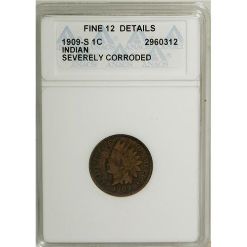 <B>1909-S 1C --Severely Corroded--ANACS. Fine 12 Details.</B></I> NGC Census: (106/1116). PCGS Population (105/1144). Mintage: 309,000. Numismedia Wsl. Price for NGC/PCGS coin in F12: $421. (#2238)<BR><BR><b>Shipping:</b> Coins & Currency (<a target="_blank" href="http://www.heritageauctions.com/common/shipping.php">view shipping information</a>)