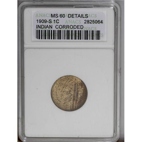 1909-S 1C --Corroded-ANACS. MS60 Details. An arc of red 1909-S[1C]--Corroded--ANACS. MS60 Details.