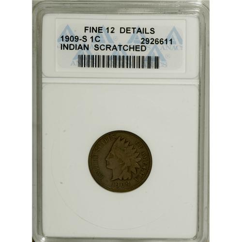 <B>1909-S 1C --Scratched--ANACS. F12 Details.</B></I> NGC Census: (105/1101). PCGS Population (103/1115). Mintage: 309,000. Numismedia Wsl. Price: $421. (#2238)<BR><BR><b>Shipping:</b> Coin/Currency (<a target="_blank" href="http://www.heritageauctions.com/common/shipping.php">view shipping information</a>)