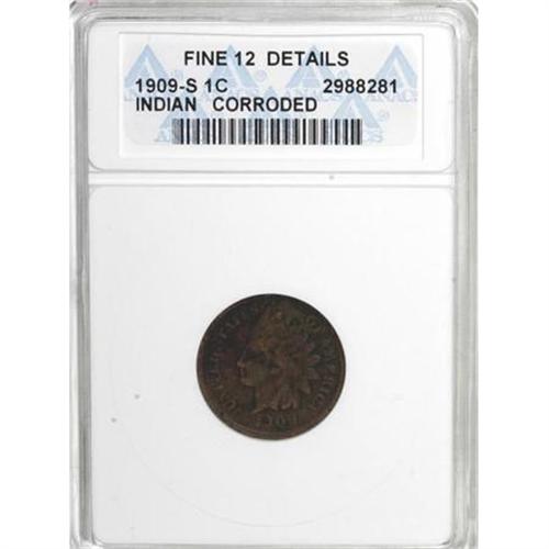 <B>1909-S 1C --Corroded--ANACS. Fine 12 Details.</B></I> NGC Census: (57/689). PCGS Population (105/1137). Mintage: 309,000. Numismedia Wsl. Price for NGC/PCGS coin in F12: $421. (#2238)<BR><BR><B>Coin Engraver:</B> James B. Longacre<BR><BR><b>Shipping:</b> Coins & Currency (<a target="_blank" href="http://www.heritageauctions.com/common/shipping.php">view shipping information</a>\)