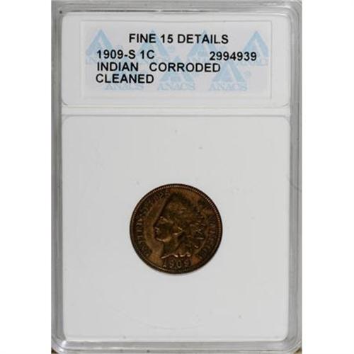 <B>1909-S 1C --Cleaned, Corroded--ANACS. Fine 15 Details.</B></I> NGC Census: (52/644). PCGS Population (110/1089). Mintage: 309,000. Numismedia Wsl. Price for NGC/PCGS coin in F15: $428. (#2238)<BR><BR><B>Coin Engraver:</B> James B. Longacre<BR><BR><b>Shipping:</b> Coins & Currency (<a target="_blank" href="http://www.heritageauctions.com/common/shipping.php">view shipping information</a>)