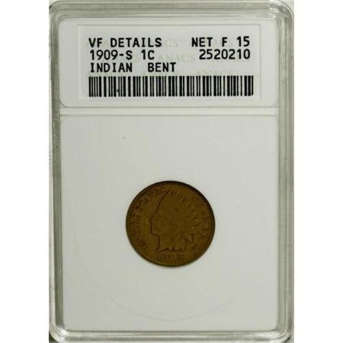 <B>1909-S 1C --Bent--ANACS. VF Details, Net Fine 15.</B></I> NGC Census: (55/659). PCGS Population (110/1104). Mintage: 309,000. Numismedia Wsl. Price for NGC/PCGS coin in F15: $428. (#2238)<BR><BR><B>Coin Engraver:</B> James B. Longacre<BR><BR><b>Shipping:</b> Coins & Currency (<a target="_blank" href="http://www.heritageauctions.com/common/shipping.php">view shipping information</a>)