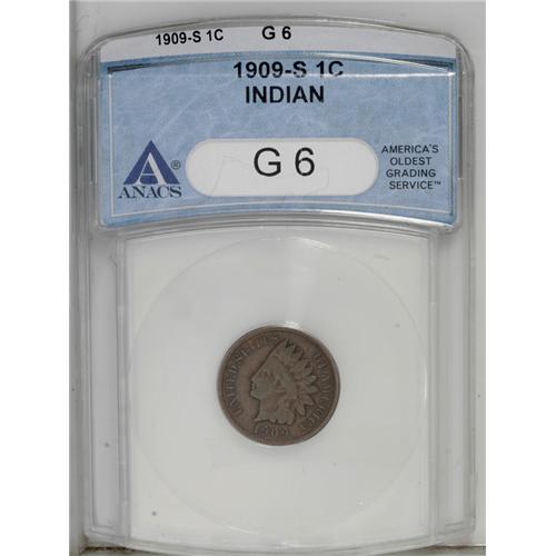 <B>1909-S<1C> Good 6 ANACS.</B></I> Attractive olive and tan color accompanies smooth, problem free surfaces on this desirable San Francisco Mint Indian cent. Nearly VG quality with three partial letters visible in LIBERTY.
