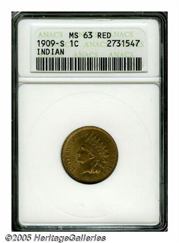 <B>1909-S<1C> MS63 Red ANACS.</B></I> This key date specimen possesses golden-orange toning overlaying lustrous surfaces, and the design elements are well struck throughout. All four diamonds show. A couple of minute marks on the Indian's cheek limit the grade.