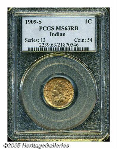 <B>1909-S<1C> MS63 Red and Brown PCGS.</B></I> This key date representative has lustrous coppery-gold surfaces overlain with dappled tan patina on the obverse and mottled gold-brown toning on the reverse. The design elemental are well impressed, with all four diamonds revealing nice definition. No mentionable contact marks are present, but a small piece of foreign mater appears to be located in the field to the left of the Indian's nose.