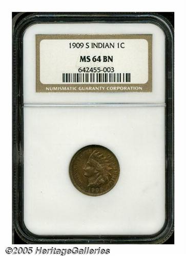 <B>1909-S<1C> MS64 Brown NGC.</B></I> This lovely golden-brown near-Gem has good luster and remarkably smooth surfaces. A subtle spot near the final A in AMERICA and a hint of striking softness on the tips of the headdress feathers do not appear to limit the grade.
