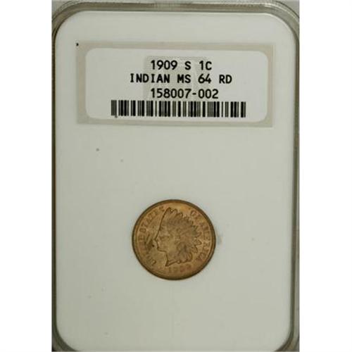 <B>1909-S 1C MS64 Red NGC.</B></I> Vibrant copper-gold luster adorns both sides of this key-date Indian Head cent, and an attentive strike sharpens most of the design elements, save for the usual softness in some of the feather ends. All four diamonds are bold. Scattered carbon spots deny a higher grade.<BR><BR><B>Coin Engraver:</B> James B. Longacre<BR><BR><b>Shipping:</b> Coins & Currency (<a target="_blank" href="http://www.heritageauctions.com/common/shipping.php">view shipping information</a>)
