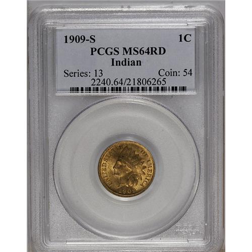 <B>1909-S<1C> MS64 Red PCGS.</B></I> A nice, attractive copper-gold example of this lowest-mintage Indian cent. The mintmark is slightly larger than that used on the 1909-S Lincoln cents, and the top loop of the S is nearly closed; the lower loop is considerably more open. This issue is much, much rarer than either 1909-S Lincoln, with or <I>sans</B></I> VDB. As confirmation, PCGS has graded these quantities of each in MS64 Red or higher: 1909-S VDB, 1663 pieces; 1909-S Lincoln, 920 coins; and 1909-S Indian, 327 coins. While full Red Gems are available, they cost much more. Why not consider this Red near-Gem for your collection?