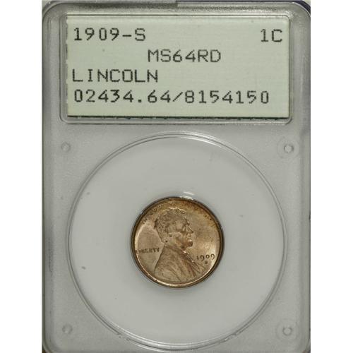 <B>1909-S 1C MS64 Red PCGS.</B></I> Well struck and lustrous, with lovely pink and red-gold coloration, a few superficial blemishes, and a number of carbon specks on the reverse that limit a Gem grade. In a first-generation small-size holder.<BR><BR><b>Shipping:</b> Coins & Currency (<a target="_blank" href="http://www.heritageauctions.com/common/shipping.php">view shipping information</a>)