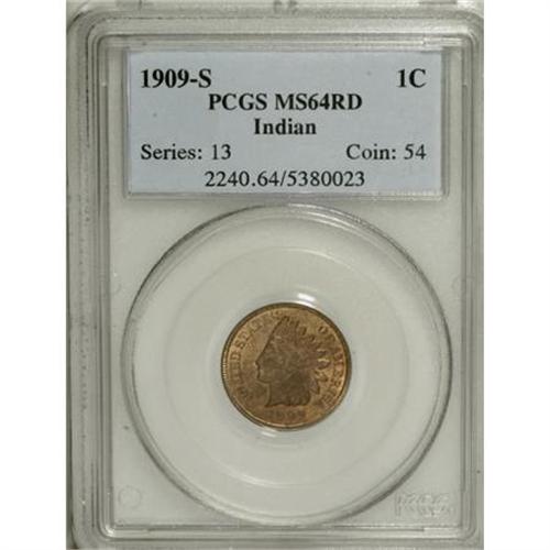<B>1909-S 1C MS64 Red PCGS.</B></I> The 1909-S Indian cent was saved as the last of its issue, making its rarity much lower than the low-mintage coins of earlier years (Richard Snow, 2006). Nevertheless, it is a popular date in the Indian Head cent series, and is necessary for the completion of a date/mintmark collection. The near-Gem example offered in this lot possesses an attractive copper-brass-gold coloration, and is sharply struck, including crisp delineation on all of the diamonds. A few minuscule marks and flecks preclude full Gem status.<BR><BR><b>Shipping:</b> Coins & Currency (<a target="_blank" href="http://www.heritageauctions.com/common/shipping.php">view shipping information</a>)